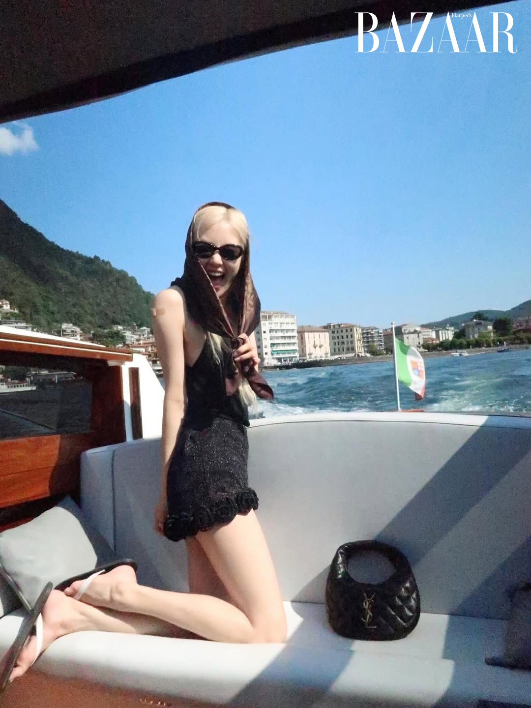 Trong khi đó, Rosé (BLACKPINK) lại chọn mẫu túi này cho kỳ nghỉ du thuyền. Cô diện áo tank top đen cổ khoét sâu kết hợp cùng quần short dệt kim ánh nhũ với phần viền hoa mềm mại, tạo nên vẻ nữ tính, thơ mộng. Khăn mỏng quấn đầu phối cùng kính mắt mèo mang lại cảm giác retro, gợi nhớ đến những thước phim điện ảnh nước Ý. Cô đi dép xỏ ngón đơn giản để giữ tổng thể thanh thoát, phù hợp không khí nghỉ dưỡng tại Ý.