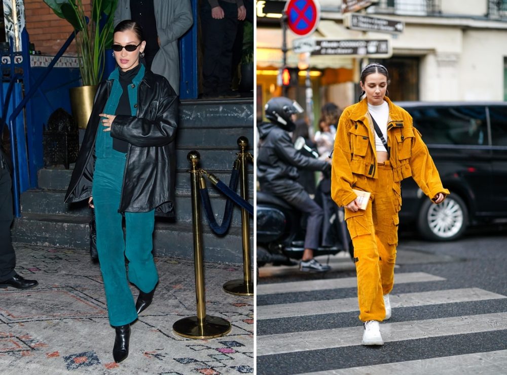 Bạn cũng có thể diện nguyên set nhung sọc tăm như hình trên. Bella Hadid (trái) diện cây corduroy của Holzweiler, khoác áo da oversize của Wolford.