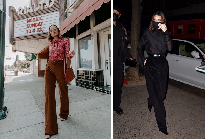 Với trang phục công sở, bạn có thể kết hợp quần nhung sọc tăm với áo sơ mi cùng tông màu như Kendall Jenner (phải).