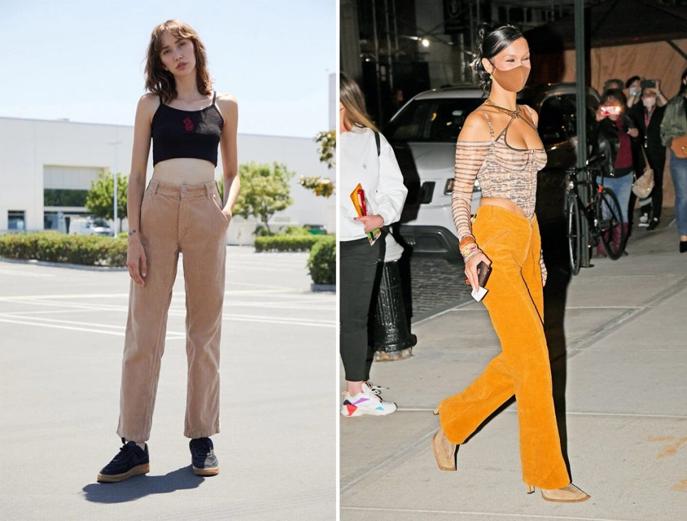 Bạn có thể kết hợp quần nhung sọc tăm của John Galt với áo crop top 2 dây như hình trái, hoặc học hỏi Bella Hadid phối áo crop top dạng yếm cầu kì với quần nhung cạp cao.