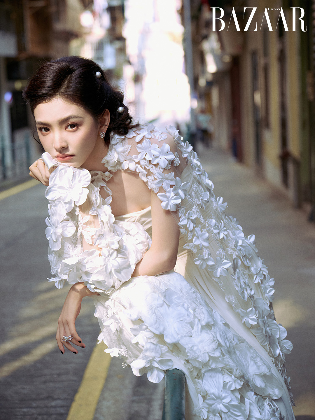 Để màn xuất hiện trên thảm đỏ không bị mờ nhạt, Chương Nhược Nam phối kèm áo choàng cape trong suốt phủ đầy những bông hoa 3D. Phụ kiện này khiến nữ diễn viên như thể một nàng thơ lạc bước giữa thành phố, mang theo cả nét hiện đại lẫn chút hoài cổ rất điện ảnh.