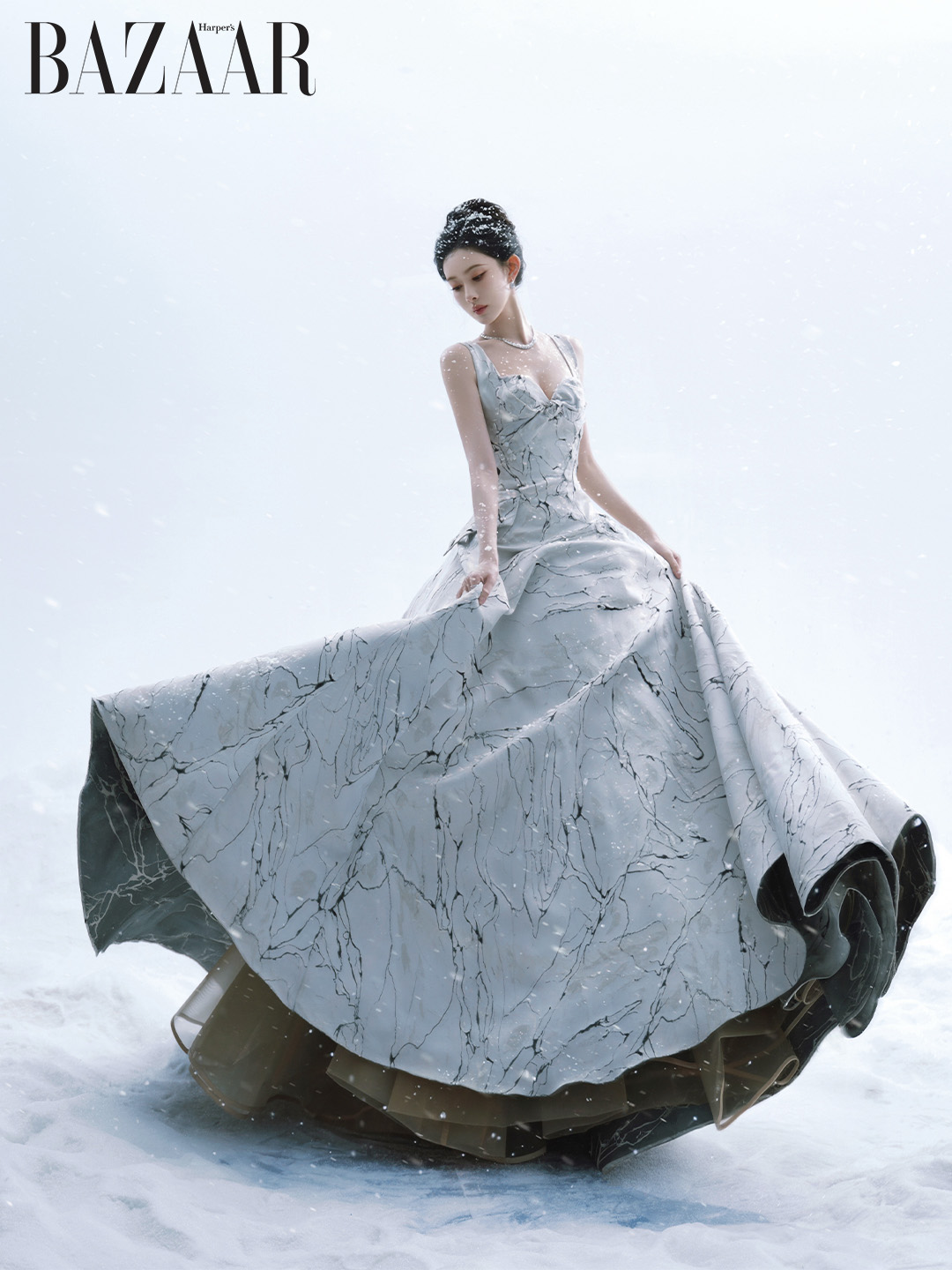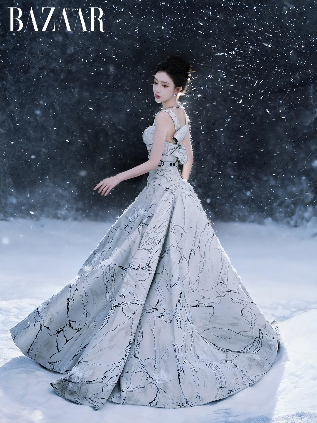 Chiếc váy với phom ball gown với phần thân trên ôm sát, khoe khéo vòng eo nhỏ, kết hợp với phần chân váy xòe rộng, bồng bềnh. Chất liệu được phủ họa tiết đường vân nứt gãy, gợi nhớ bề mặt băng rạn tự nhiên, vừa lạnh lẽo vừa giàu tính nghệ thuật. Do không trắng thuần nên chiếc váy cưới này vẫn phù hợp như đầm dạ hội cho một sự kiện long trọng như Đêm Hội Gào Thét iQIYI 2025.