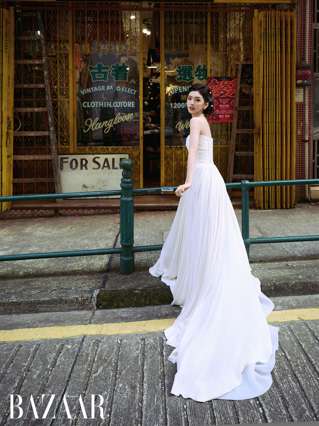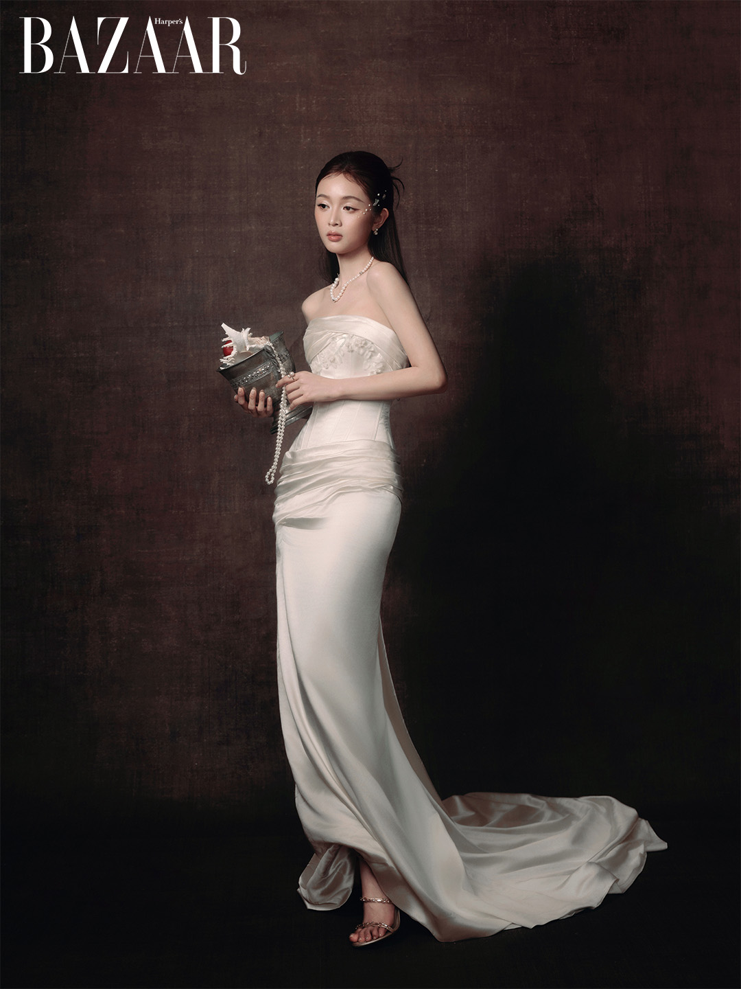 Ngô Tuyên Nghi diện chiếc váy quây trắng bằng satin, điểm hoa và có những nếp gấp vải mềm mại, đến từ dòng váy cưới Haute Couture Xuân Hè 2026 của Ines Di Santo. Thân trên theo dáng corset ôm sát tôn lên đường cong tự nhiên, trong khi phần đuôi váy trải dài tạo cảm giác uyển chuyển lại không quá cứng nhắc.