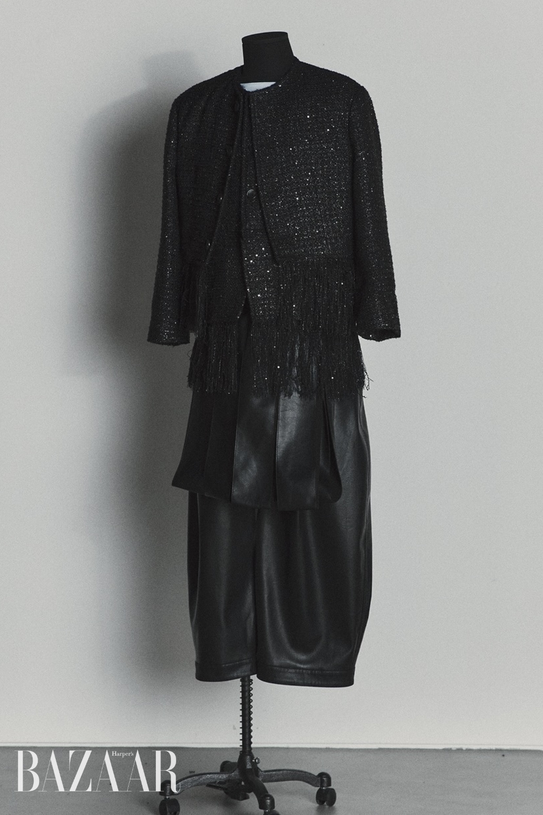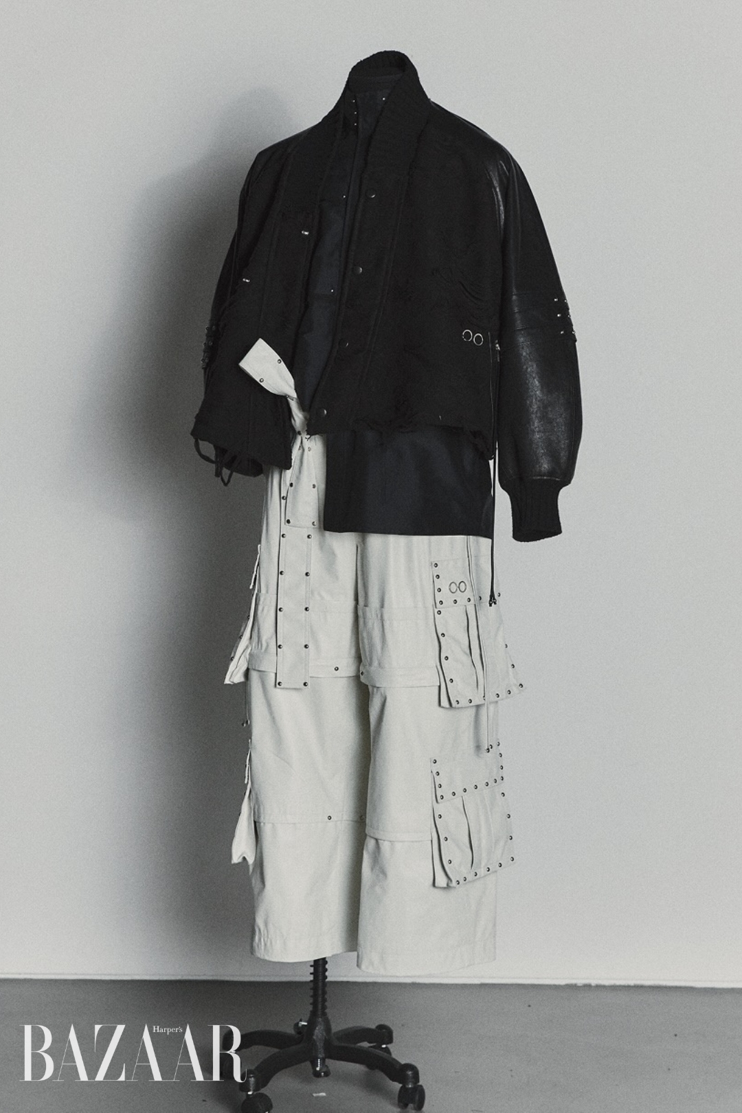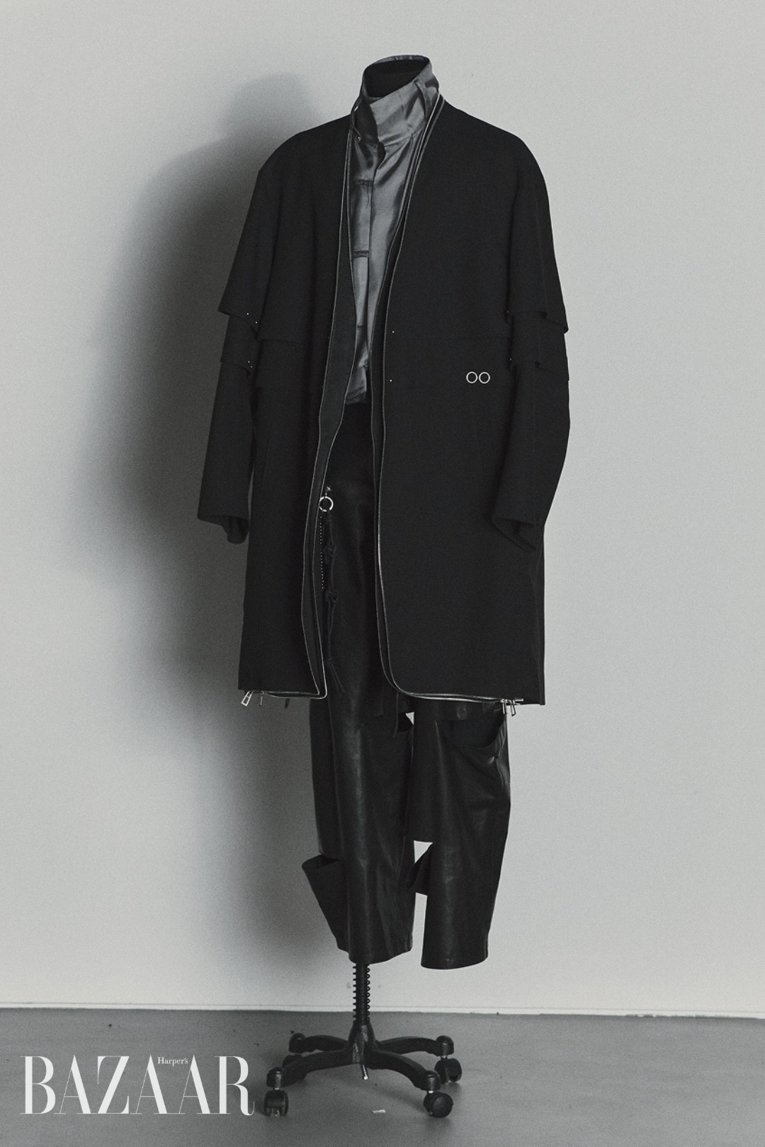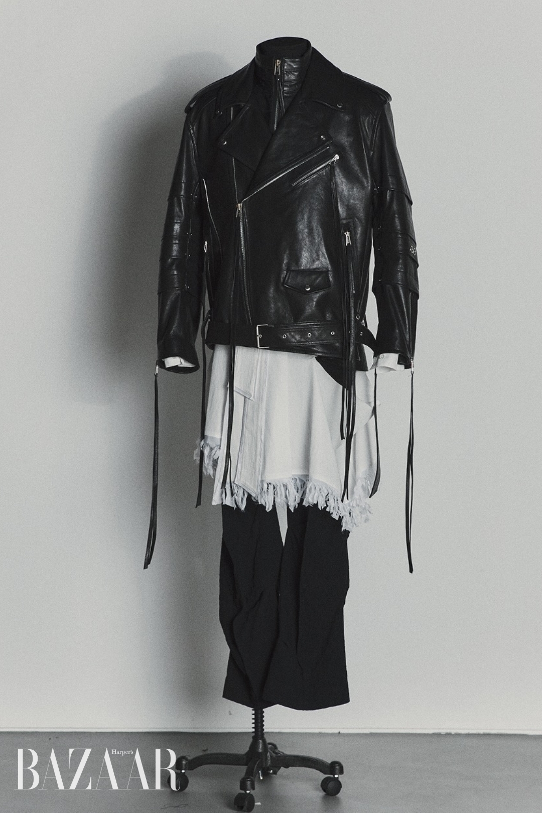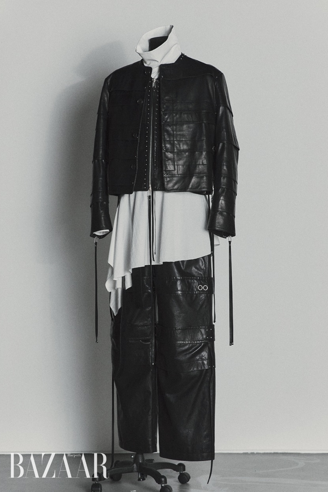 Năng lượng đa nhiệm của Jungkook – vừa là main vocal, dancer, rapper – khiến Songzio nhìn nhận em út của BTS là một người tiên phong. Áo khoác racing da bất đối xứng được tái diễn giải bằng kỹ thuật xếp nếp phương Đông, kết hợp với lớp áo trong dạng giáp và áo sơ mi phá cấu trúc, nhấn mạnh sự mãnh liệt và chuyển động không ngừng của nam thần tượng.